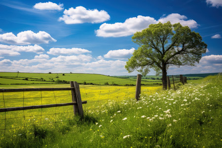 Sunny English countryside in Dorset during summer featuring green fields scattered trees wildflowers