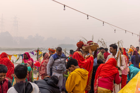 Ghaziabad, Uttar Pradesh, India - November 2021: Chhath Puja, Indian hindu devotees performing rituals of chhath puja during sunrise near river bank.