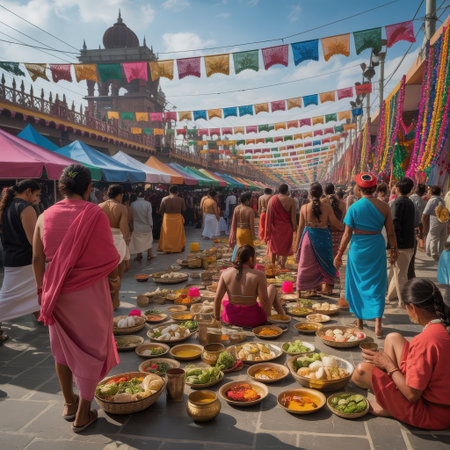 This image captures the bustling energy of a traditional Indian street market. Rows of stalls are laden with offerings, likely for a religious or cultural event, creating a vibrant tapestry of colors. People in traditional attire navigate the crowded pathways, with decorative flags strung overhead adding to the festive atmosphere. The scene evokes a sense of community and tradition.