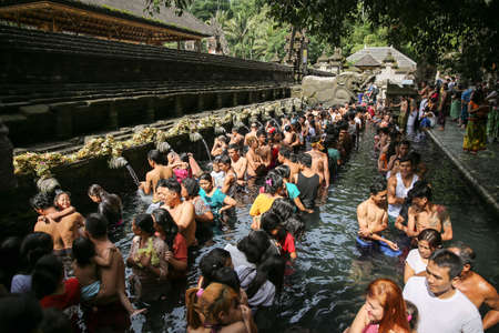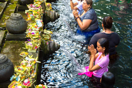 BALI, INDONESIA - April 16, 2016: Holy spring water. People praying in the Tirta Empul Temple. Bali, Indonesia.