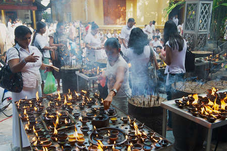 Colombo, Sri Lanka, May 17, 2011 - People light candles at the Buddhist temple during Vesak religious celebration in Colombo, Sri Lanka.