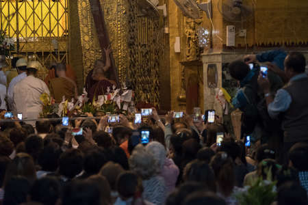 MANDALAY, MYANMAR - November 28: Unientified peoples visit and pray at Mahamuni Buddha Temple, In early morning ritual of face wash to Mahamuni Buddha. It's a major buddhist pilgrimage on November 28, 2016