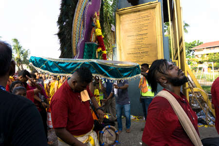 SINGAPORE, SINGAPORE - Feb 08, 2020: Thaipusam is a religious celebration by devotees. Its highlight is a barefoot walk of devotees carrying milk pots and dancing with prickly kavadis.