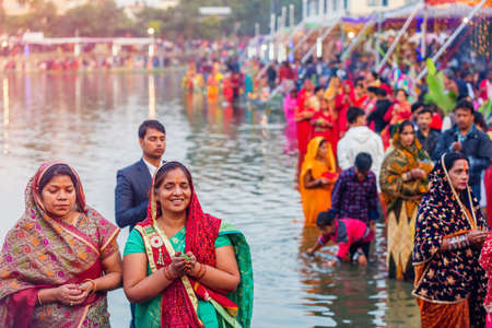 Kathmandu,Nepal - November 1,2019: Hindu devotees offering prayers to sun god standing in water according to hindu rituals during Chhath Puja Festival in Kathmandu. Chath Puja rituals