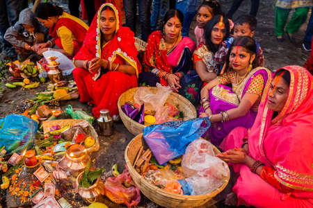 kathmandu,Nepal - November 1,2019: Nepali Hindu Women with traditional dress up during Chhath Puja Festival Celebration in Kathmandu.