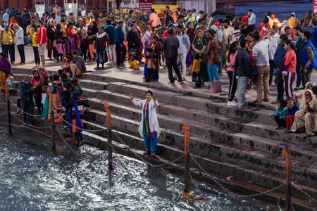 Haridwar, India - March 20, 2017: Holy ghats at Haridwar, India, sacred town for Hindu religion. Pilgrims offering floating flowers and burning candles to the Ganges River.