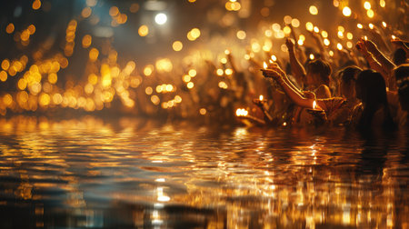Durga Puja night celebration with glowing diyas and candles reflecting on water, concept of faith and community.