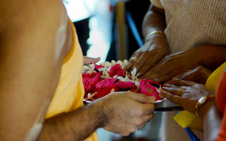 View of Indian Hindu people touch the flowers which are to be used in offering prayers to god by the priest