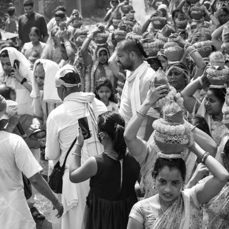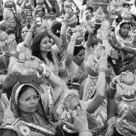 Delhi, India April 03 2022 - Women with Kalash on head during Jagannath Temple Mangal Kalash Yatra, Indian Hindu devotees carry earthen pots containing sacred water with coconut on top Black and White