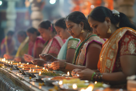 Hindu devotees perform traditional rituals with lit lamps in a serene spiritual setting