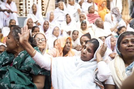 Nagpur, Maharashtra, India - March 2019: A group of Indian pilgrims sit on the floor with hands folded in prayer at the Buddhist pilgrimage site of Deekshabhoomi in the city of Nagpur.
