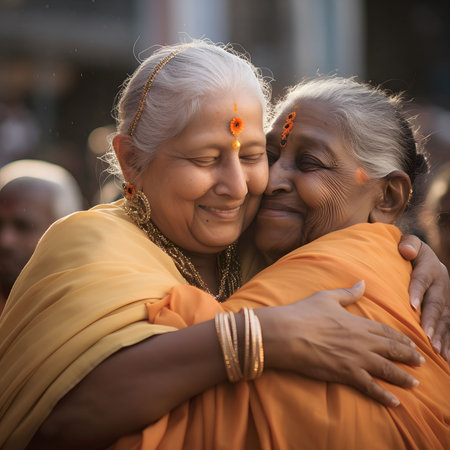 Two elderly women, dressed in vibrant traditional attire, share a heartfelt embrace during a lively festival gathering. The backdrop captures the essence of celebration, with warm light reflecting their joy and camaraderie.