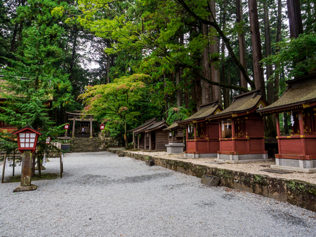 Stone Lanterns on the Side of Toshogu Shrine that lead to Futarasan Shrine in Nikko, Tochigi, JapanNIKKO, JAPAN - NOVEMBER 17, 2015: Stone Lanterns on the Side of Toshogu Shrine that lead to Futarasan shrine located between Tosho-gu shrine