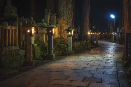 Ancient Cemetery at night inside a forrest, Okunoin Cemetery, Wakayama, Japan.