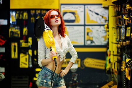 Red haired model posed with large angle grinder at store or household shop of working tools.