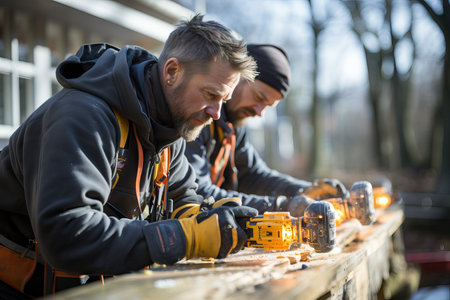 A team of male construction workers laboring on a building project at a bustling construction site.