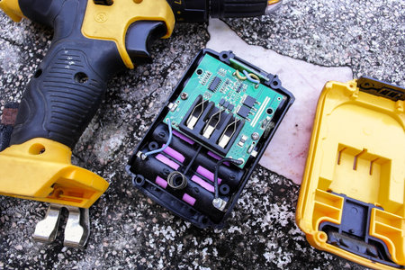 Disassembled cordless drill battery pack showing the circuit board and lithium-ion cells, symbolizing power tool repair, battery technology, and electronic maintenance.