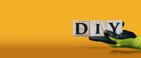 Manual worker with protective work gloves holding a Diy text made of wooden blocks (Do It Yourself), on a yellow and orange background with copy space.