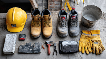 A detailed arrangement of construction tools and safety gear on a tabletop, showcasing essential items for building projects and site preparations.