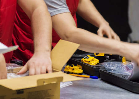 Photo of hands assembles a computer monitor system block on an conveyor belt at a monoblock assembly plant. Modern high-tech factory