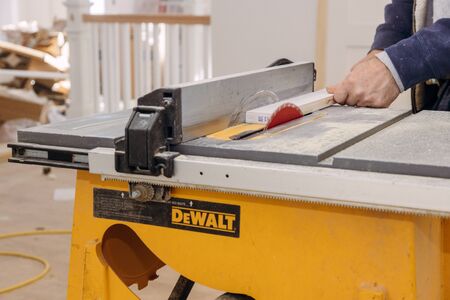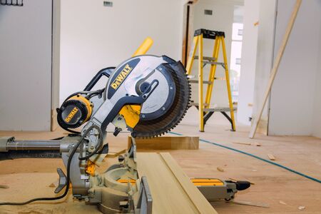 Los Angeles CA DEC 20 2019: Contractor using DeWalt circular saw cutting wood baseboard moulding for Renovation