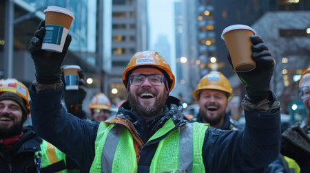 Close-up of engineers in winter hats and safety gear, celebrating with raised coffee cups