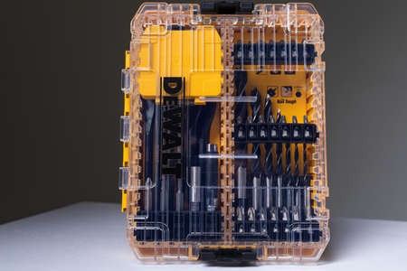 Closeup photo shot of open yellow and transparent kit box with drills for drilling holes and screwdriver on a white table and isolated on background. Repair and construction concept. Set of tools