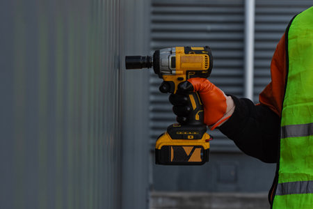 A worker in a protective vest and gloves presses an impact wrench against a metal wall, demonstrating the workflow on a construction site