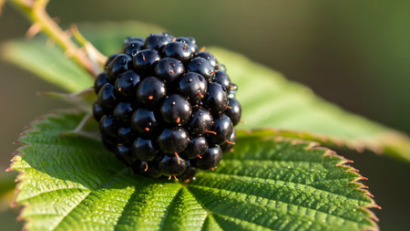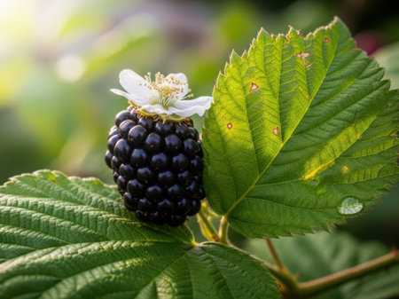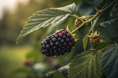 Ripe blackberry hangs from a green plant, surrounded by leaves and unripe berries. Soft light casts a warm glow, highlighting the details of the fruit in a tranquil garden setting.