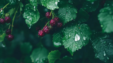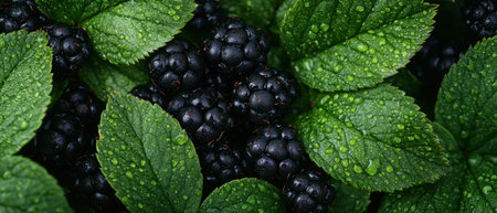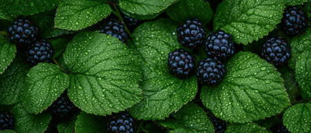 Fresh blackberries and dew-covered leaves in a lush garden nature scene