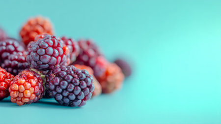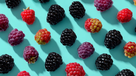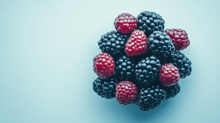 A vibrant arrangement of fresh blackberries and raspberries on a light blue background. Perfect for healthy food, summer recipes, or nutrition themes.