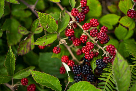 Ripe and unripe blackberries on the bush with selective focus. Bunch of berries.