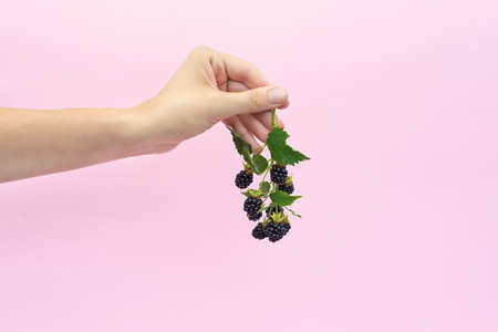 Blackberry branch in female hand isolated on light pink background. Bramble or dewberry in hand.