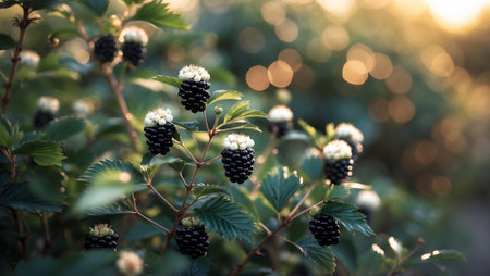 Blackberries growing in a lush garden at sunset with a soft, warm glow illuminating the scene