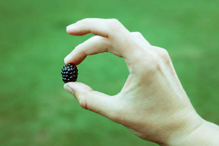 Hand holds blackberry with fingers