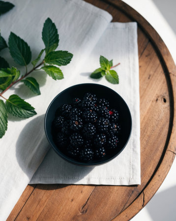 AI Generated. Black bowl with black berries on wooden table surrounded by leaves and mint sprig