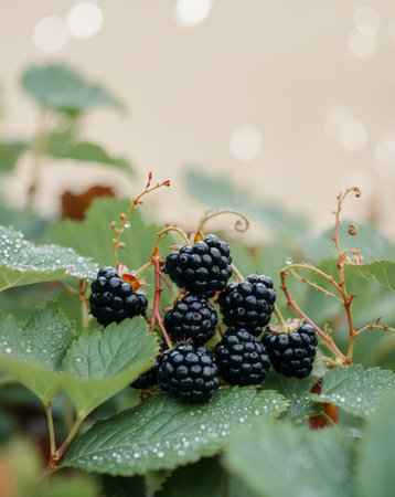 Close-up of a cluster of ripe blackberries on a thorny bush, glistening with morning dew, ready for picking.