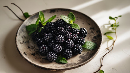 AI Generated. Pile of blackberries and mint on wooden plate