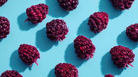 A stunning overhead view of fresh blackberries on a bright blue surface, displaying their vibrant color and juicy texture. Ideal for healthy lifestyle themes.