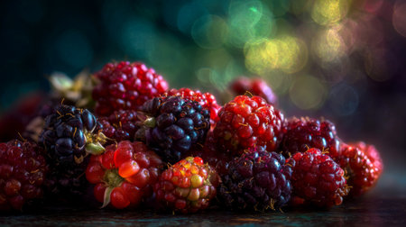 A stunning close-up of mixed raspberries showcases their rich colors and textures against a beautifully blurred background, highlighting their natural beauty and freshness.