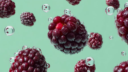 This dynamic image showcases fresh blackberries suspended in water droplets against a mint green backdrop, ideal for health and food-related themes.