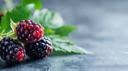 Close-up image of fresh blackberries resting on a dark surface, accented by vibrant green leaves, showcasing juicy berries perfect for healthy snacks or gourmet dishes.