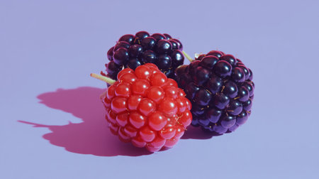 This image showcases fresh raspberries and blackberries against a purple background, highlighting their vibrant colors and natural appeal for health-themed presentations.