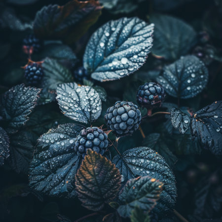 Blackberry Forest Glow - dark glossy berries arranged among green leaves, morning dew glistening, soft sunlight filtering through mist, cool-toned