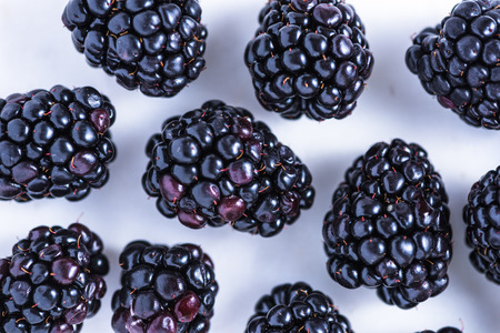 Fresh blackberries from above on white marble background
