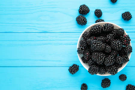 Blackberries in a bowl on blue wooden table. Healthly food