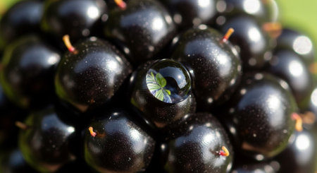 Close-up of water droplets forming a dazzling crown atop a cluster of blackberries