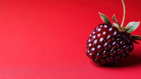 A single fresh blackberry rests on a vibrant pink background, showcasing its rich purple hue and natural green leaf, perfect for health and nutrition themes.