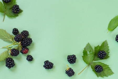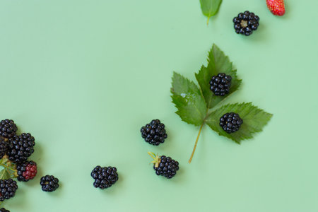 Fresh blackberries and leaves in a minimalist style on a green background.