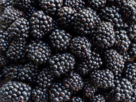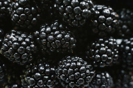 Fresh ripe blackberries as background close up, top view.